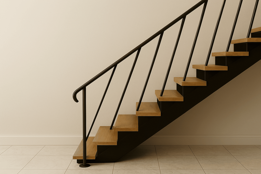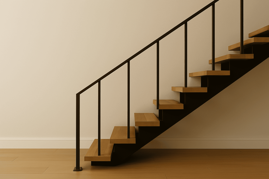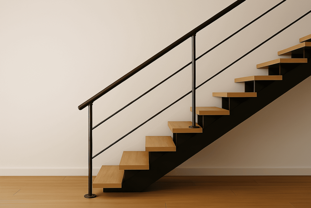 Untuk tampilan yang tegas dan industrial, model railing tangga besi hollow hitam adalah pilihan paling solid. Desainnya maskulin, kuat, dan sangat tahan lama, ideal untuk hunian modern bergaya industrial.