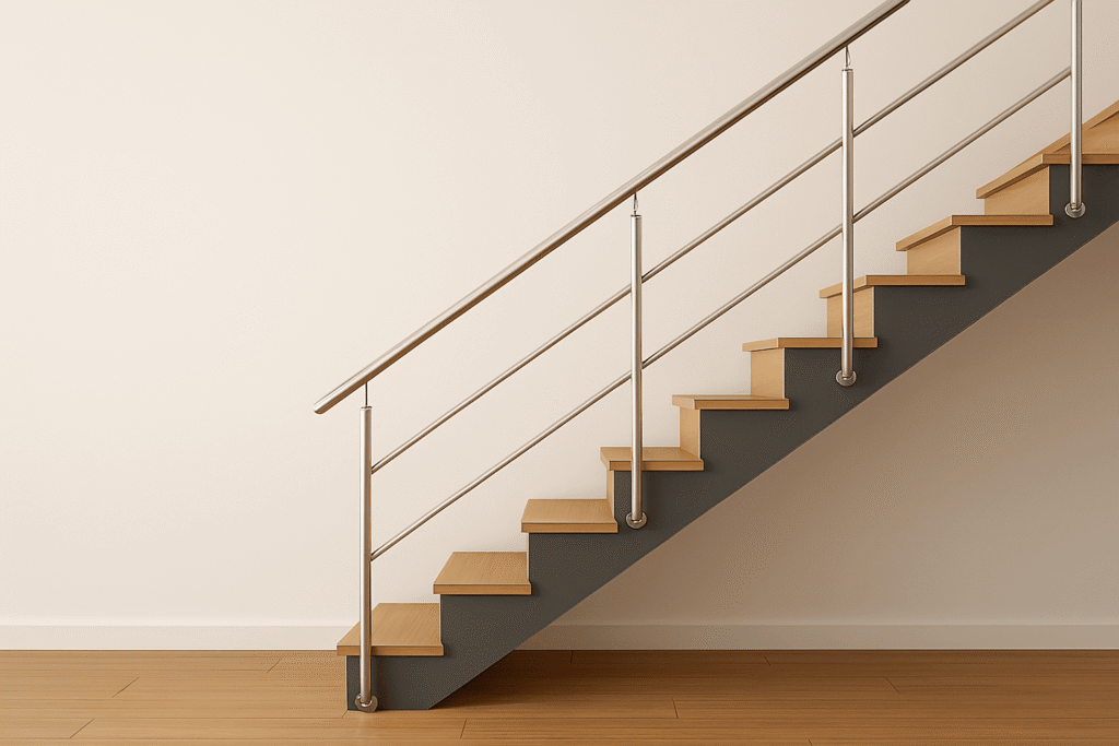 Material railing tangga stainless memang tidak pernah gagal memberikan tampilan modern futuristik. Alasan memilih model ini dikarenakan stainless tahan karat, mudah dibersihkan, dan selalu terlihat premium. Cocok untuk Anda yang ingin hunian terasa high-end tanpa ribet perawatan.