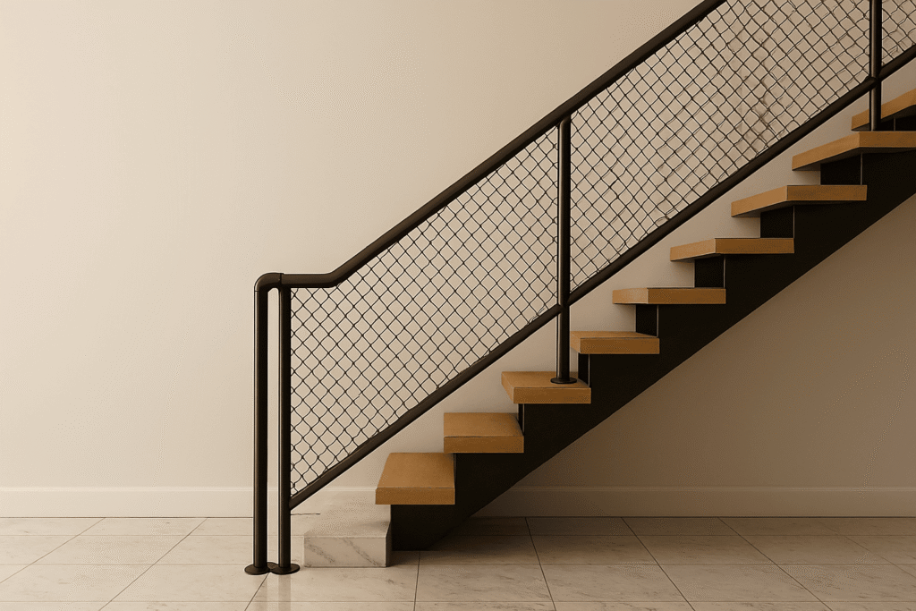 Selanjutnya ada railing mesh wire industrial. Konsep mesh wire memberikan kesan urban dan edgy untuk rumah minimalis. Aman untuk anak-anak, sirkulasi udara tetap optimal, dan tampilannya estetik untuk gaya industrial modern.