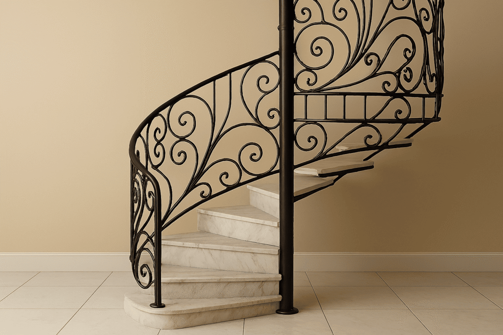 Railing tangga spiral artistik juga bisa menjadi pilihan. Motif melingkar ini selalu berhasil mencuri perhatian karena bentuknya yang elegan. Selain hemat ruang, model ini memberi identitas artistik yang kuat pada hunian modern.