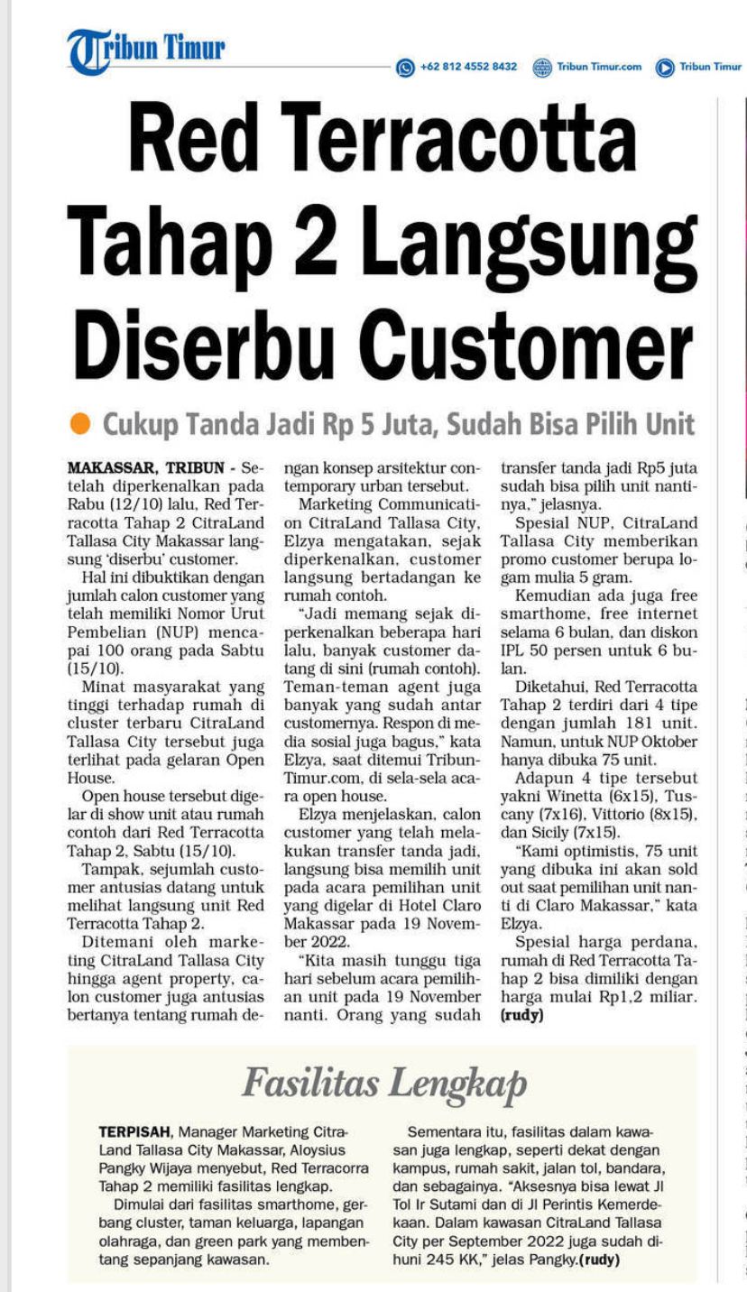 TRIBUN-TIMUR.COM, MAKASSAR – Setelah diperkenalkan pada Rabu (12/10/2022) lalu, Red Terracotta Tahap 2 CitraLand Tallasa City Makassar langsung ‘diserbu’ customer.