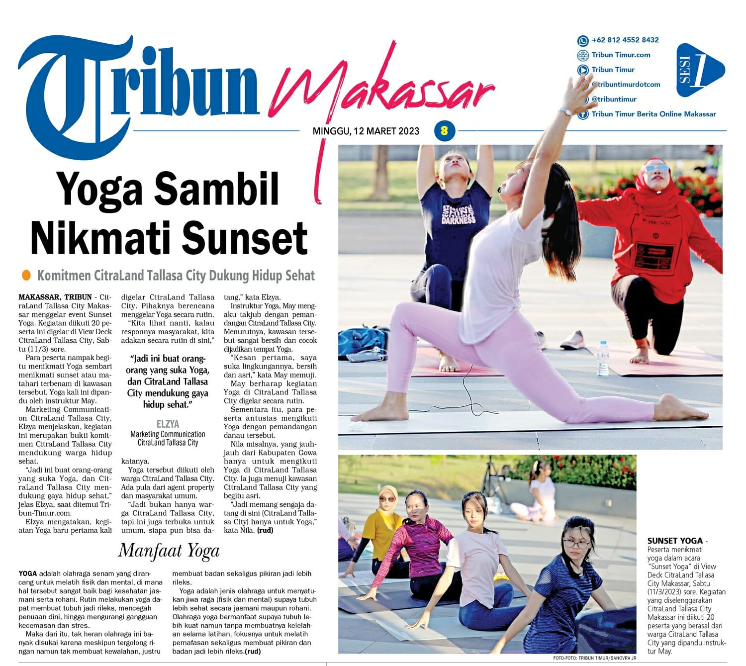 Marketing Communication CitraLand Tallasa City Elzya menjelaskan event Yoga Sambil Nikmati Sunset ini merupakan bukti komitmen CitraLand Tallasa City mendukung warga hidup sehat. “Jadi ini buat orang-orang yang suka Yoga dan CitraLand Tallasa City mendukung gaya hidup sehat,” jelas Elzya.